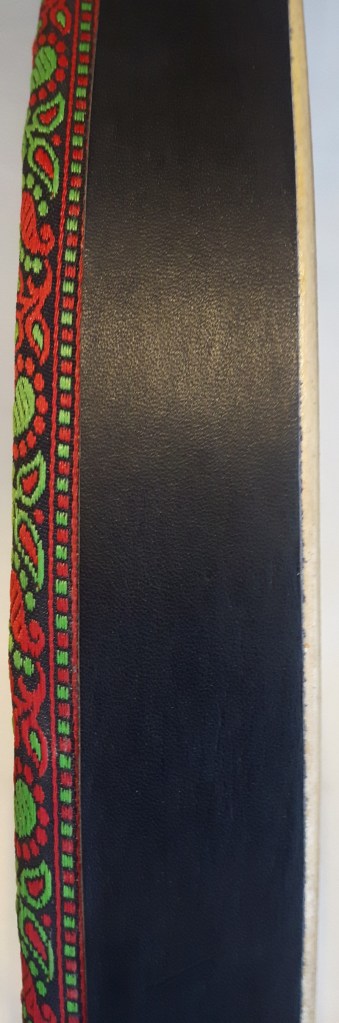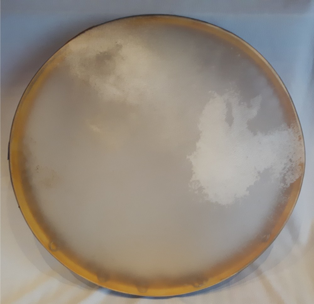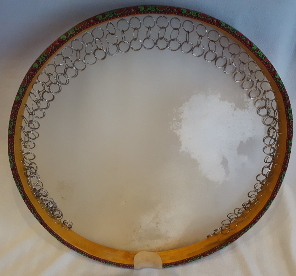 Article vendu – dimensions: Ø 40 cm / profondeur 5 cm cadre en peuplier, peau de chèvre bande en cuir. Pré-accordé et stable