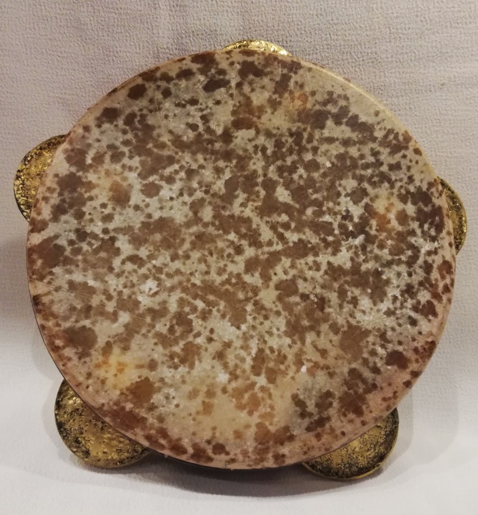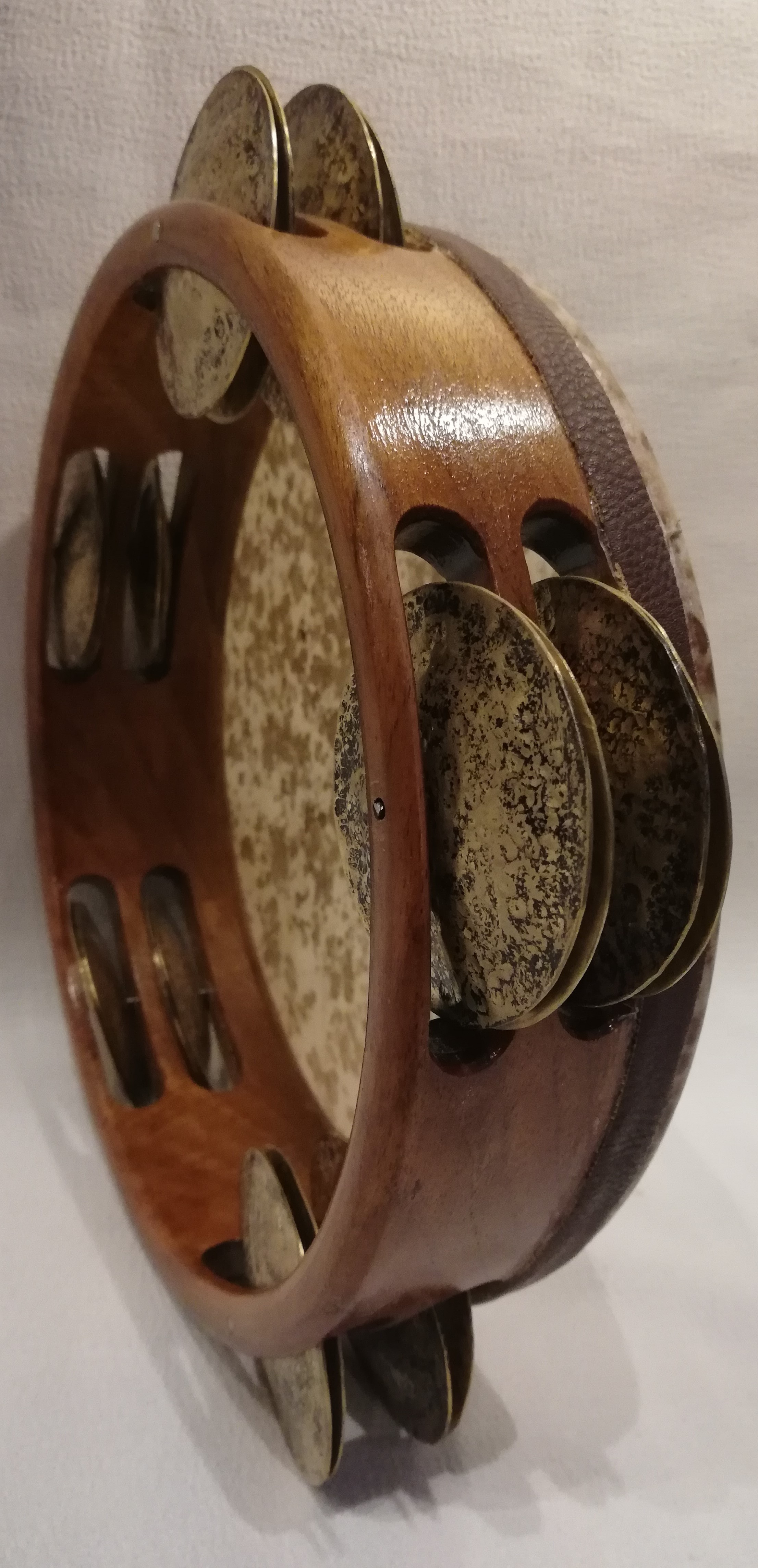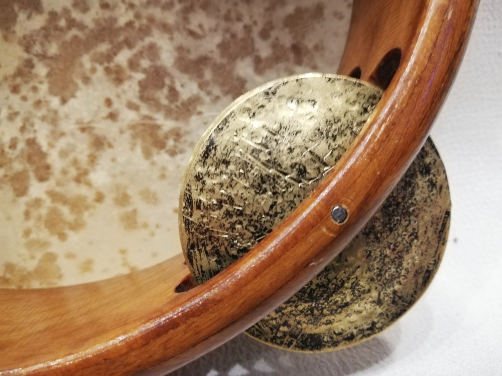 Article vendu – Type de peau(x) : peau naturelle de poisson (Raie)\nDimensions : diam. 22 cm / larg. 6 cm\nBois : noyer \nCymbales : 20 pièces / laiton martelé (épaisseur 0,2 mm).\nSystème d’accordage : sans système d’accordage. Pré-accordé et stable.