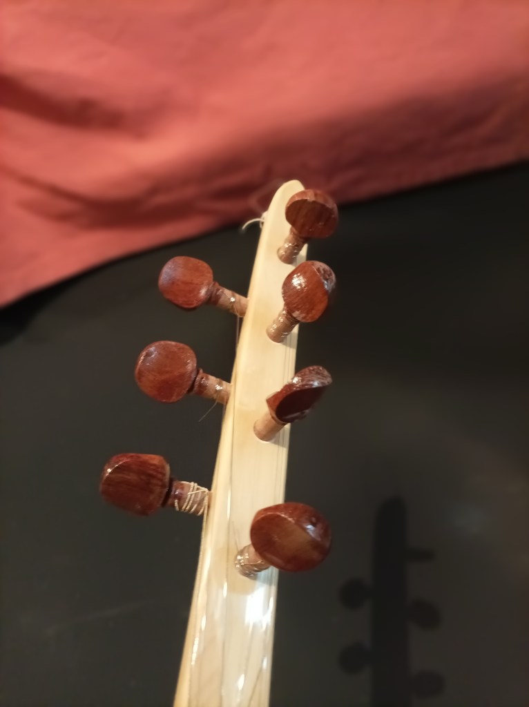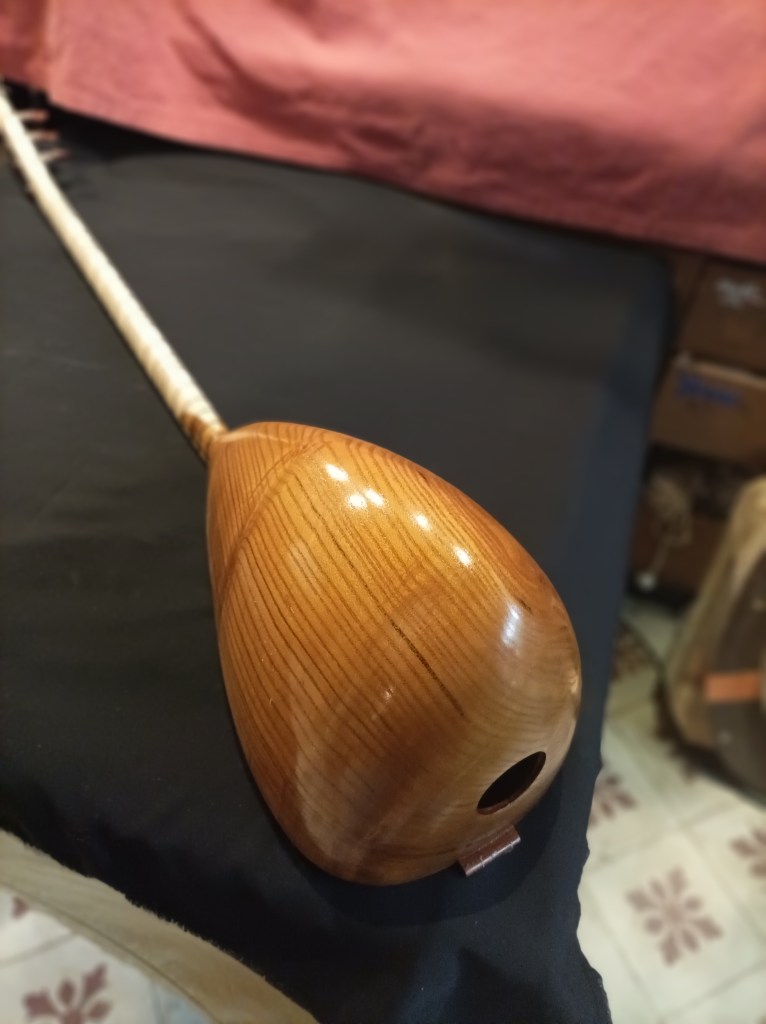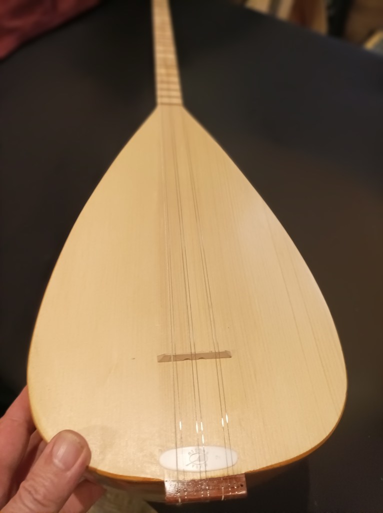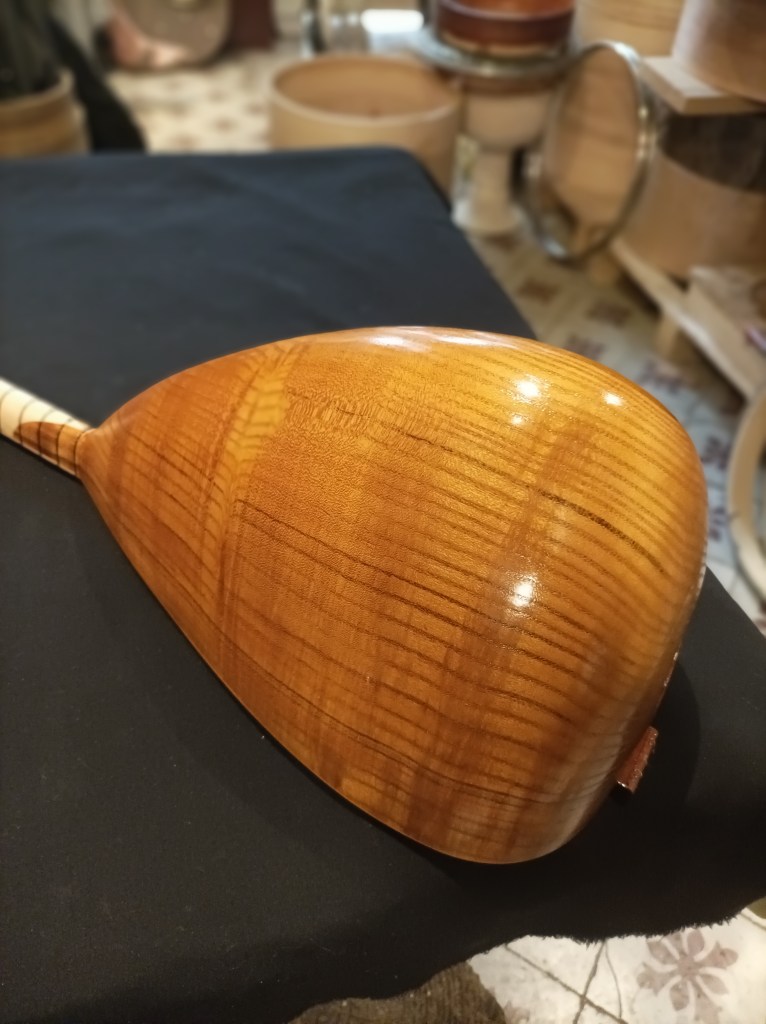 Luthier Turque (Faremez), saz à 7 cordes, 22 frets, caisse en bois de mûrier longueur totale de l’instrument 110 cm Taille de la caisse de résonance : L. 38 cm l. 20 cm P. 20 cm Table en épicéa, manche en érable (22 frets), clefs en Bois de Rose 550€ Frais de port : 22€ (tarifs indicatifs Colissimo La Poste)+ frais de ports supplémentaires pour les pays limitrophes